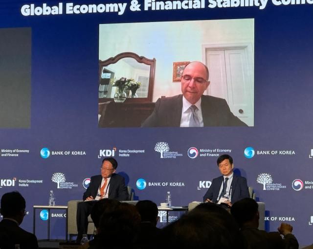 신성환 한국은행 금융통화위원(왼쪽)이 3일 서울 플라자호텔에서 열린 ‘2024 세계 경제와 금융 안정’ 컨퍼런스에서 발언하고 있다. [사진=장선아 기자]