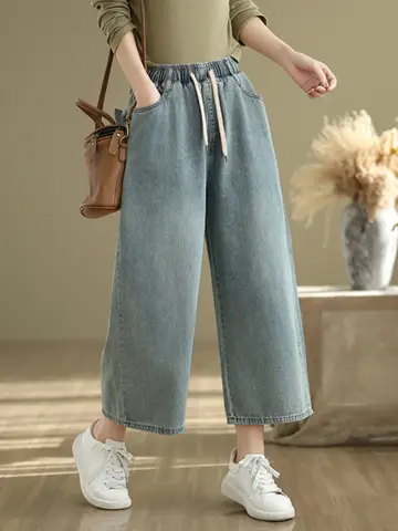 예술적 넓은 다리 Dstring 데님 청바지 여성의 느슨한 작은 크기 9 피스 레트로 슬림 스트레이트 튜브 바지 봄 패션