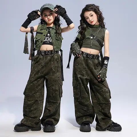 키즈 힙합 의류 육군 녹색 민소매 자르기 자켓 탱크 탑 카모 캐주얼 와이드 카고 바지 소녀 재즈 댄스 의상 옷