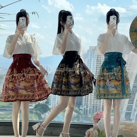 2025 중국 밍 스타일 데일리 자카드 한푸 의류, 다용도 크로스 칼라 한푸 상의, 짧고 긴 눈부신 말 얼굴 스커트