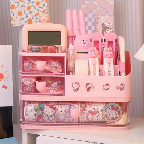 MINISO 펜 홀더 학교 문구 서랍 보관함 선물 사무실 테이블 펜 홀더 주최자 귀여운 & 헬로 키티 쿠로미 스티커