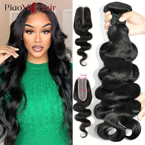 번들 포함 레이스 클로저 바디 웨이브 100% 인모 번들, 중간 부분 클로저 포함, 여성용 브라질 생모 연장, 2×6
